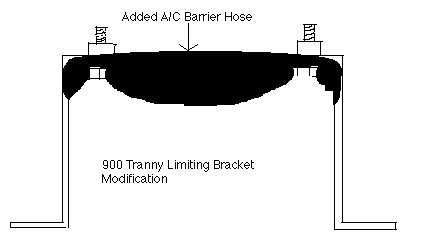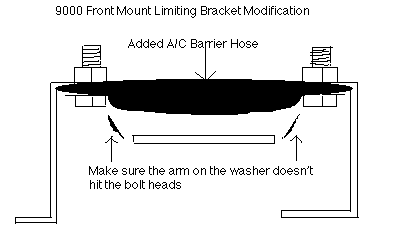 Jack up the car on the right side. Look in and find the front lower engine mount. You can raise the engine slightly to inspect it for the same thing as above. To modify its bracket, remove the inner 10 mm nut and feel for the 14 mm that secures its other end and remove it. Some 9000 brackets require drilling for the bolt holes but essentially the same procedure as above with a piece of ac line. Drill the holes for 6 mm bolts(1/4") at the edges of the bottom of the U, spaced in enough to allow the washer you use not to extend pass the edge of the bracket. Position the split ac line around the inner surface of the bottom of the U bracket. Drill straight through the ac line and run the bolts through it so that they squeeze it flat when tightened. Countersunk machine screws work best and use no washer on the bottom on the ac line. This will allow them to pull into the ac line and not contact the tab on the washer on the top of the mount when it comes up to contact the bracket. Reinstall the bracket.