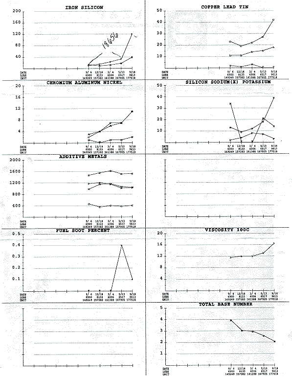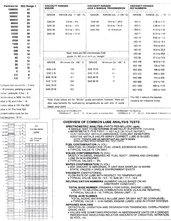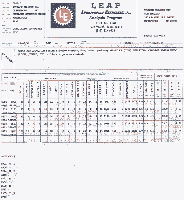 The pages below show the content of the engine oil on a customers car during an attempt to establish a mileage interval for change using a synthetic oiul made by Lubrication Engineers. We thought the results were quite interesting. The customer is a sales rep for the company manufacturing that particular oil. We do not use the oil, nor recommend an interval as long as this. The study showed his interval to be 25000 miles before change was indicated. He does change the filter every 3000 miles and tops off the oil level at that time. At this time his car has 300000 miles on it with no oil related failures. Lubrication engineers supplies oils mainly for industrial applications. This is another example of the benefits of synthetic oils.