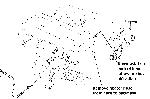 It is a good idea to back flush the cooling system while it is empty. On 900s, remove the clamp on the hose running to the inside of the car from the continuation of the metal pipe coming from the 90 degree bypass hose you checked above. The pipe will turn up and come out just behind the a/c compressor. Undo the clamp there and remove the hose. On 9000s, use the heater hose than comes off the back of the head. Place a water hose in the hose you removed from this pipe and allow the water to run through the car until it comes out clear everywhere. You will need to give the hose a chance to run it everywhere you open to be sure and really flush the system. Place the water hose in the reservoir for a while, in the top radiator hose for a while when you get it off, and in the metal pipe you took the hose off of previously to start the flushing, but use the rubber hose going into the interior of the car for the most flushing.